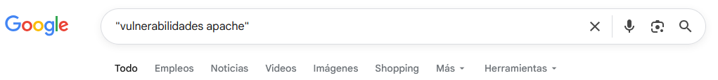 El operador de comillas dobles transforma esto en una búsqueda de secuencia exacta. - Sólo encontrarás resultados donde Apache esté después de la palabra vulnerabilidades, y es replicable para cualquier otra cadena de texto como nombres ;)
