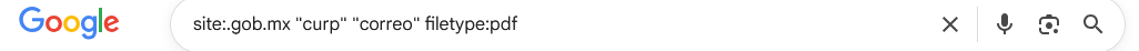 | Documentos con CURPs expuestos | "CURP" filetype:pdf OR filetype:xls site:.gob.mx |