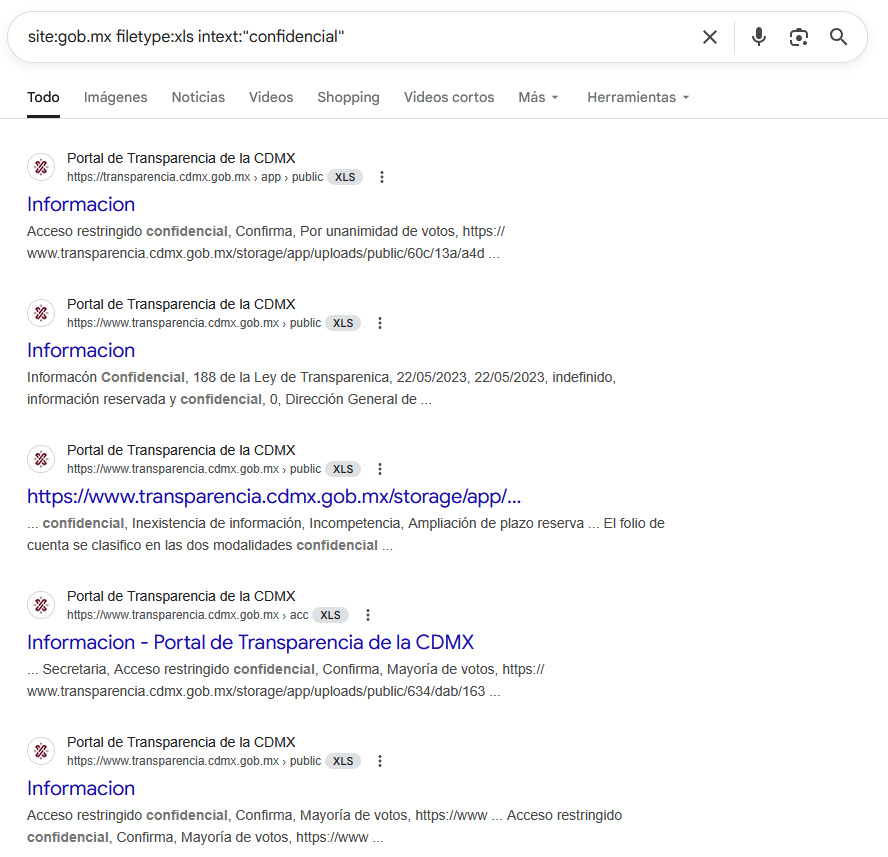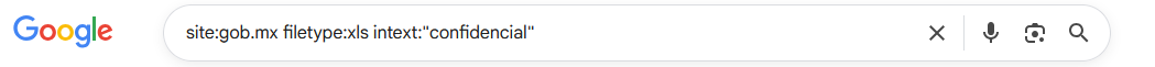 | Archivos Excel con información sensible en sitios gubernamentales | site:.gob.mx filetype:xls (confidencial OR reservado OR "datos personales") |