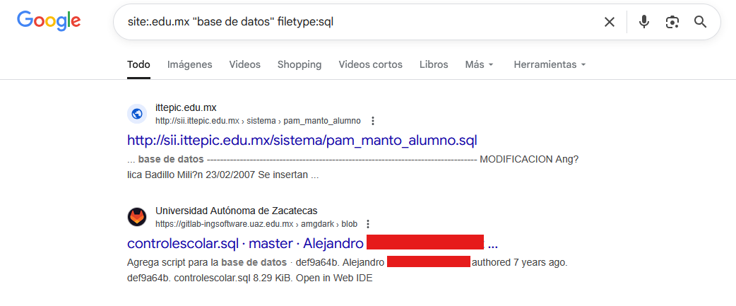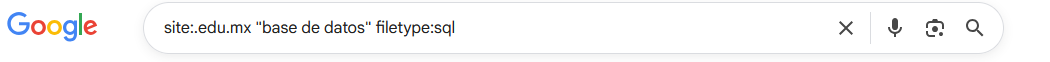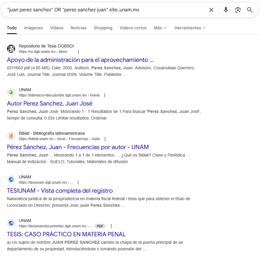 | Búsqueda de información personal propia | "juan perez sanchez" OR "perez sanchez juan" (site:.gob.mx OR site:.edu.mx) |