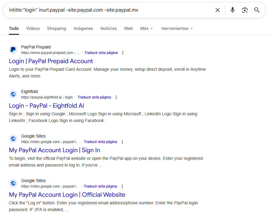 | Páginas de login que no son del dominio oficial | intitle:"login" inurl:paypal -site:paypal.com -site:paypal.mx |