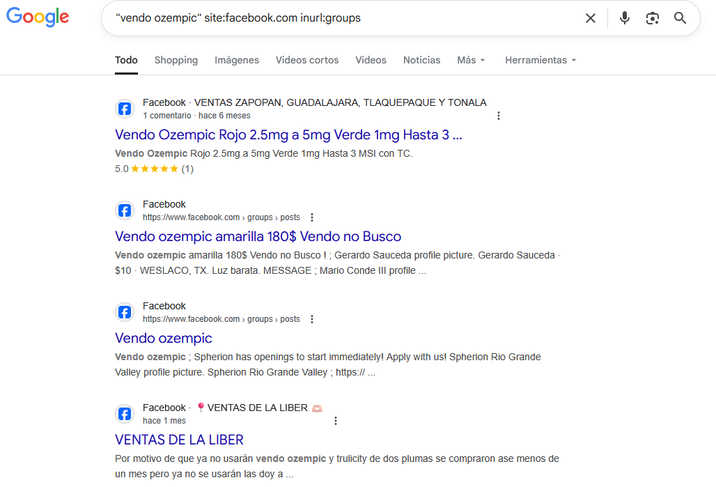 | Detección de venta irregular de medicamentos | "vendo ozempic" (site:facebook.com OR site:mercadolibre.com.mx) inurl:groups |
