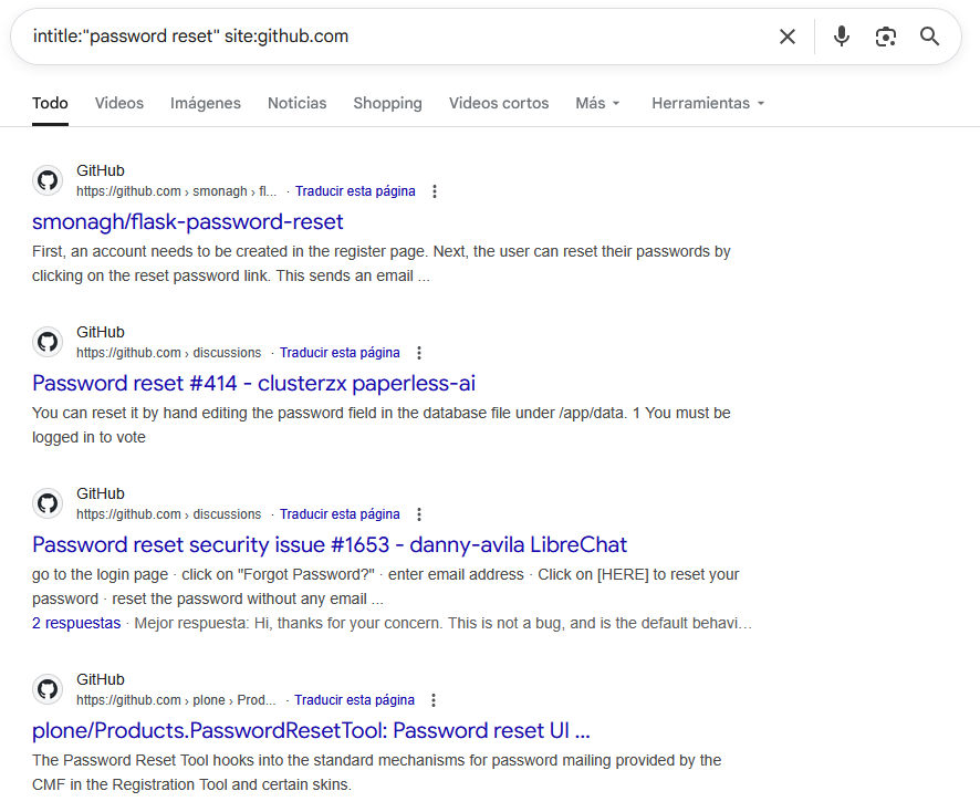 Esta consulta localiza páginas en GitHub cuyo título contiene la frase exacta "password reset", útil para identificar funcionalidades de restablecimiento de contraseñas en repositorios públicos.