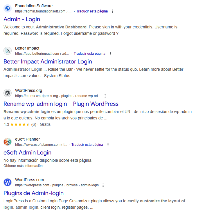 En este caso, todos los resultados tendrán presente las palabras admin y login en la URL.