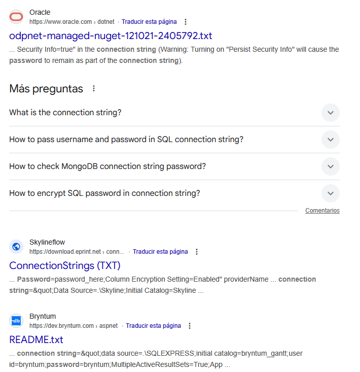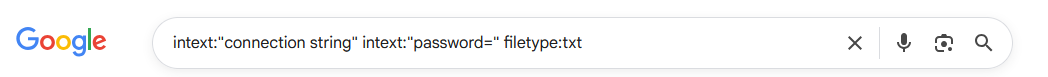 Busca términos en el contenido textual del cuerpo del documento. | intext:"connection string" filetype:txt |