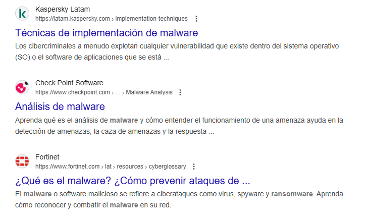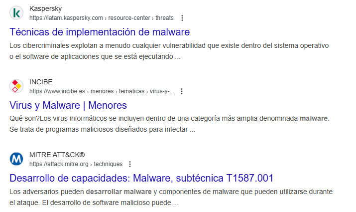 De hecho, como puedes ver los resultados se tratan de todo lo contrario. Son publicaciones sobre cómo prevenir el malware (es obvio que el INCIBE y Kaspersky no te enseñarán a desarrollar malware)
